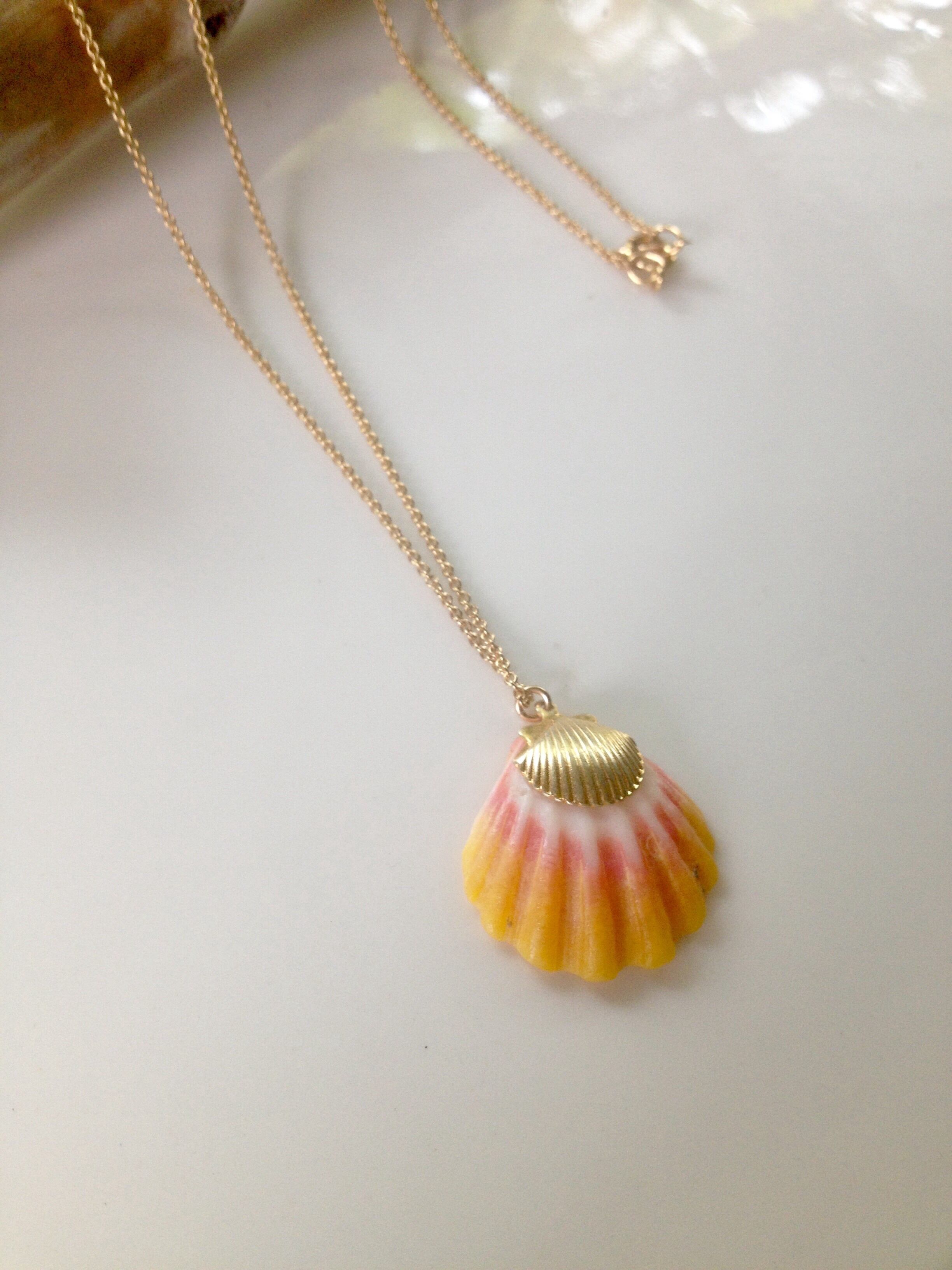 人気のサンライズシェルのネックレスです。ピンクと濃いめのイエローカラーが美しいサンライズシェルに、